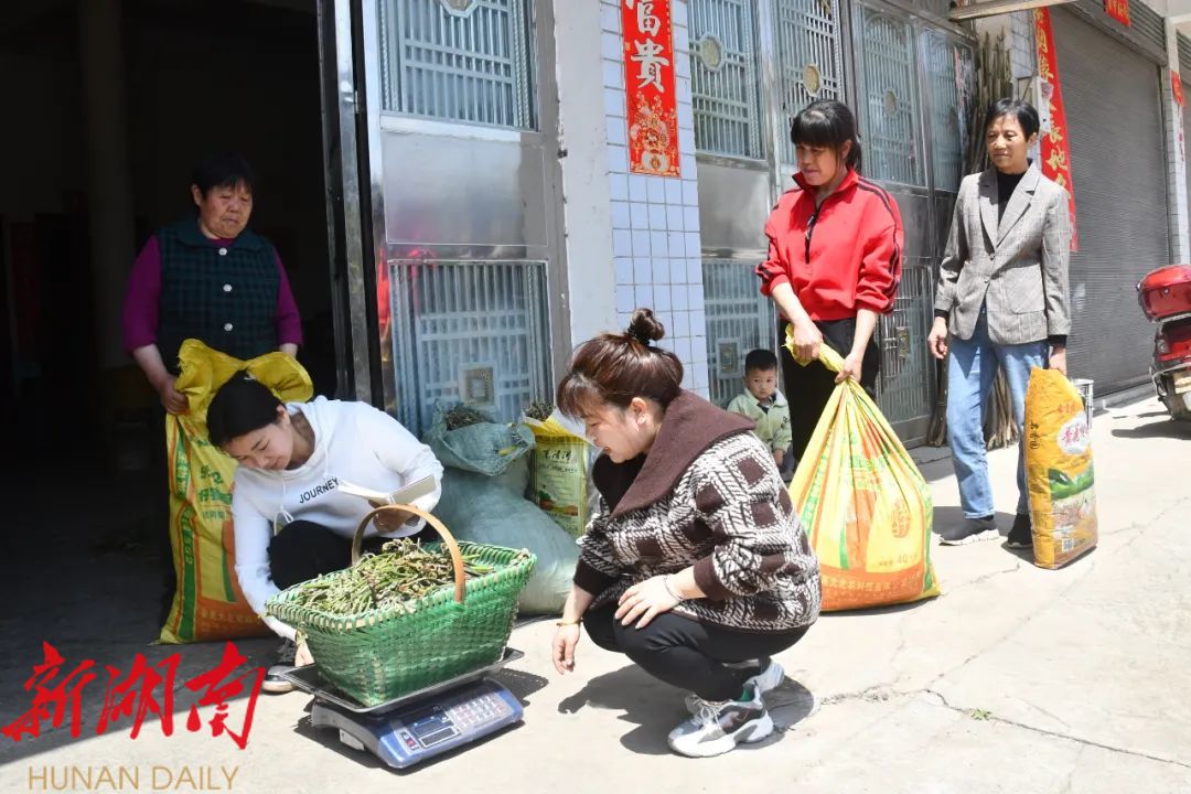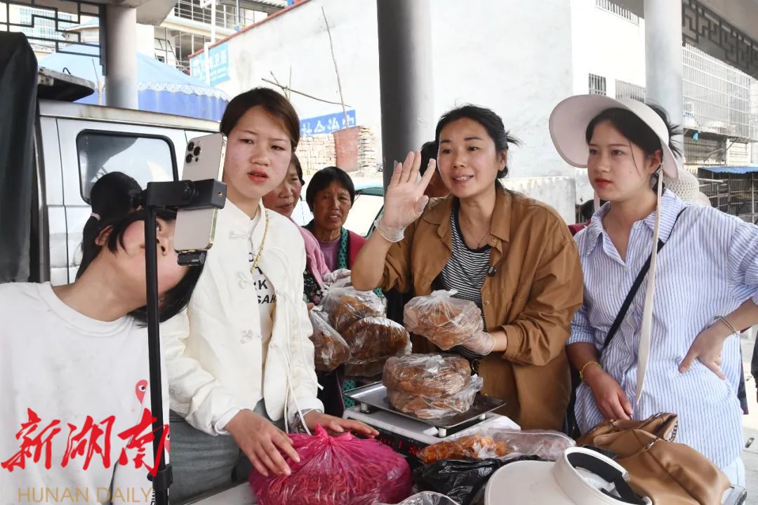 新新邵客户端4月29日讯 4月25日,是新邵县大新镇大新农贸市场赶集的日子。一大早,网红“湘中烈姐”就带领团队伙伴们赶过来,有的选择场地,有的摆放支架,有的维持秩序,准备着又一次的直播公益带货。经过一上午的忙碌,她们共完成销售3200余元。看到村民的山野菜变成了“真金白银”,即将成为城里人餐桌上的“香饽饽”,“湘中烈姐”的成就感满满的。