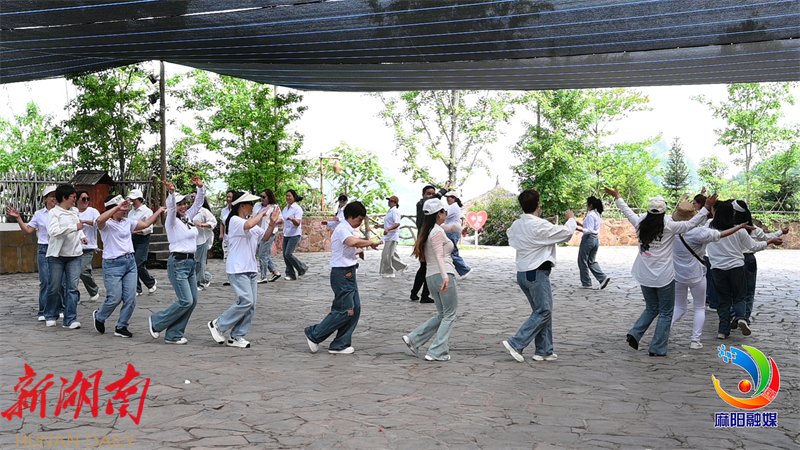景色宜人,独具特色的麻阳霞飞云果园也吸引了周边县市区的市民慕名前来,在苗家小院内,二十几名游客围成圈,进行团建活动。桃花居前,市民黄慧和家人围坐一桌,兴高采烈地商量着下次假期旅行目的地:“这次老爸老妈来云果园玩得非常开心,下次我们一起去北海,我已经做好旅游攻略了”。大家异口同声地答应,一家人其乐融融。