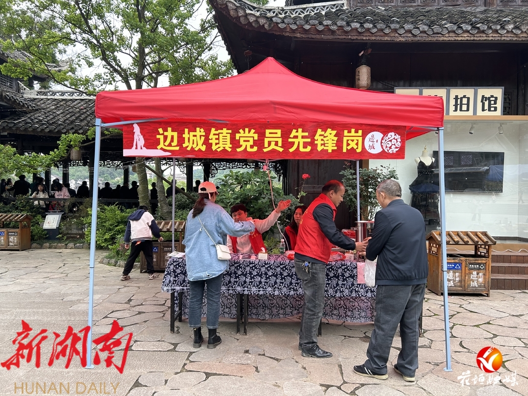“五一”假期期间,花垣县边城茶峒景区志愿者穿戴统一的红马甲,用良好的状态、饱满的热情、有温度的服务迎接八方游客,为这个假期又增添了一道靓丽风景。