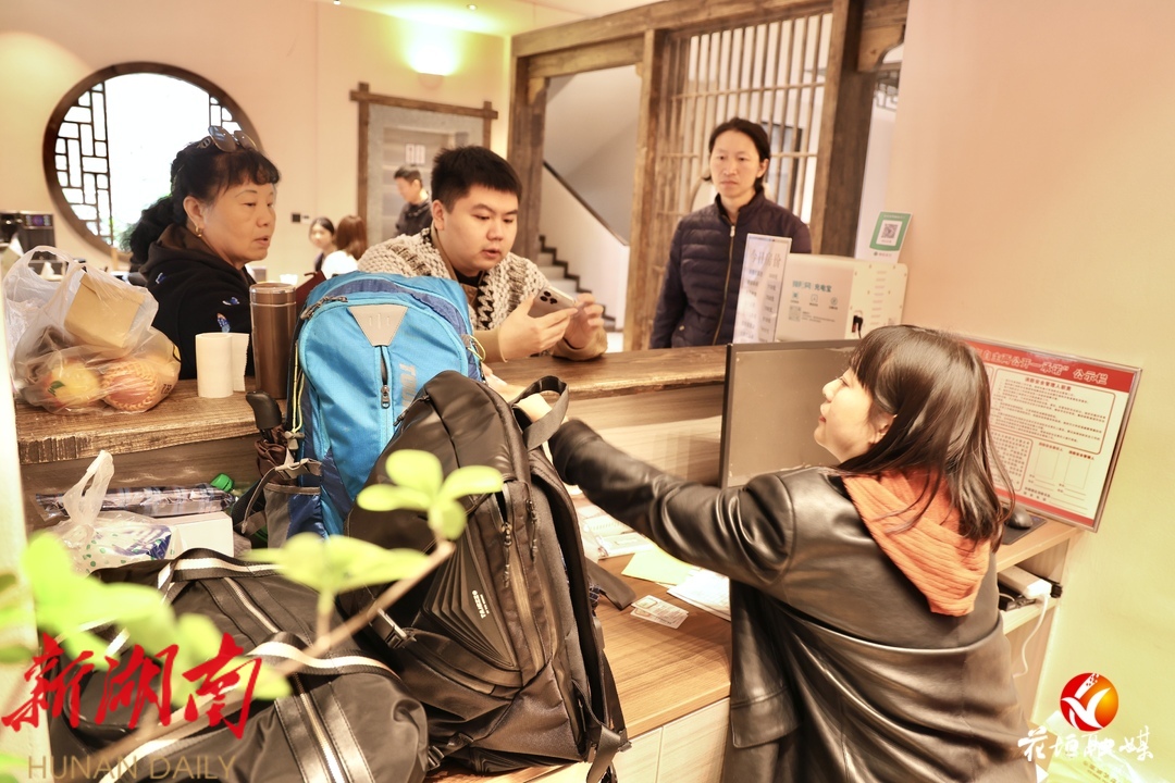 在“良园”酒店内,前台工作人员正在给一批长沙来的游客办理入住登记。