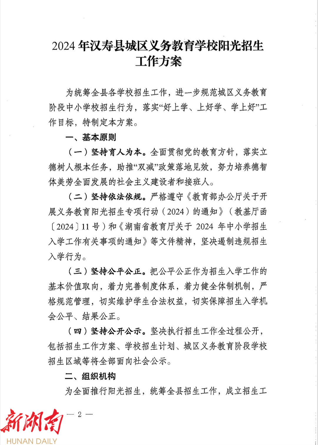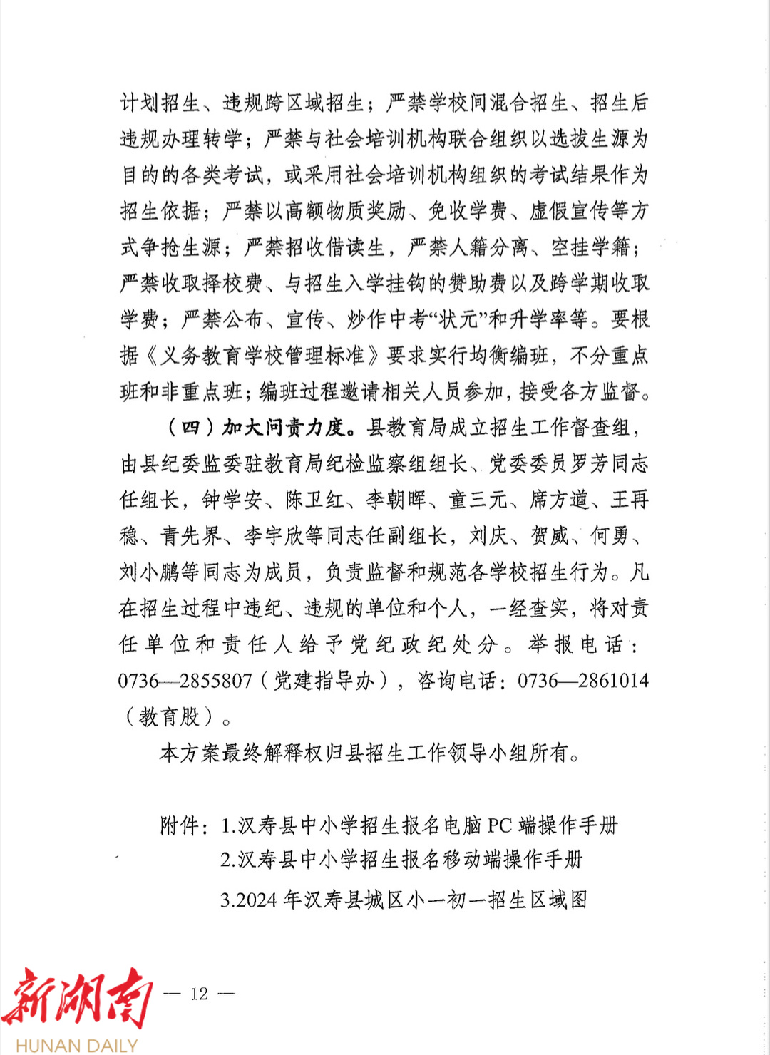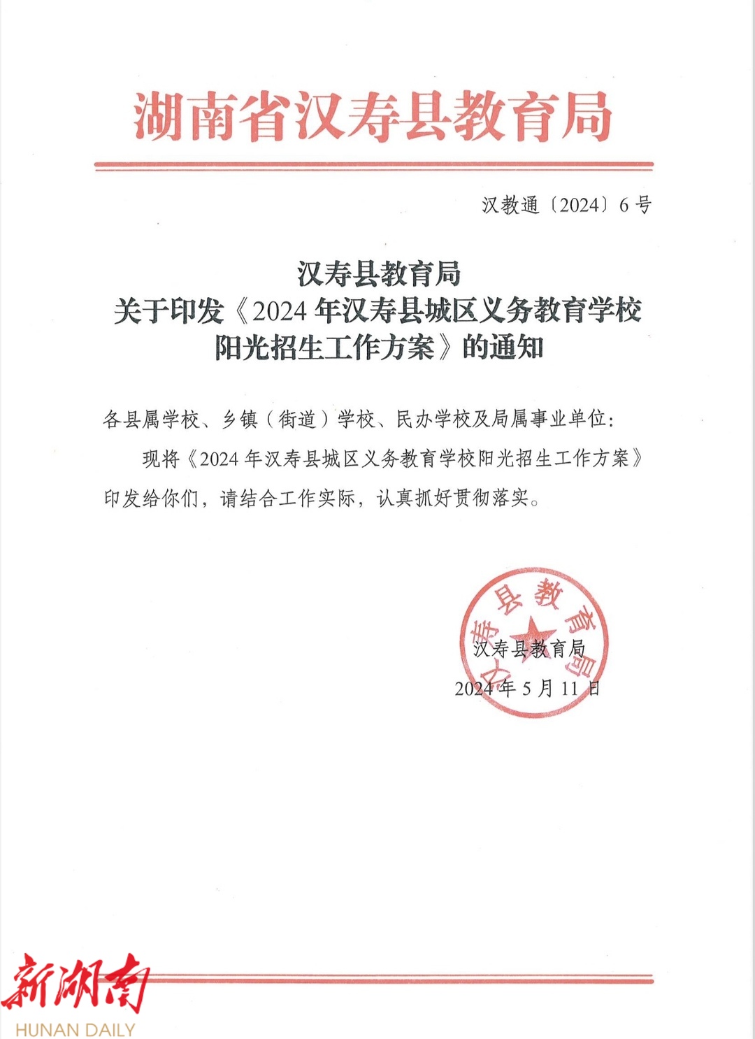 汉寿县教育局关于印发《2024年汉寿县城区义务教育学校阳光招生工作方案》的通知