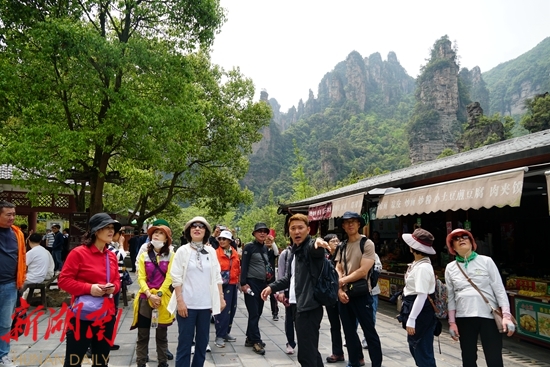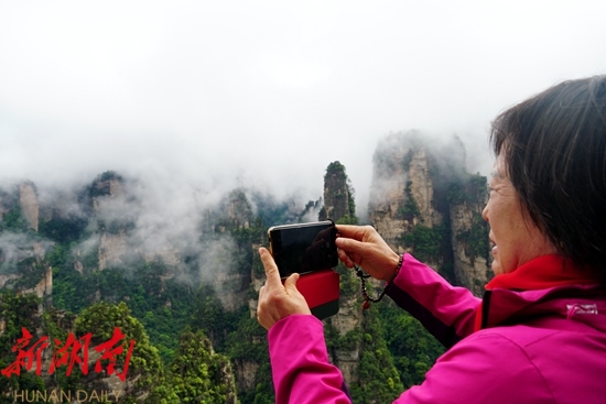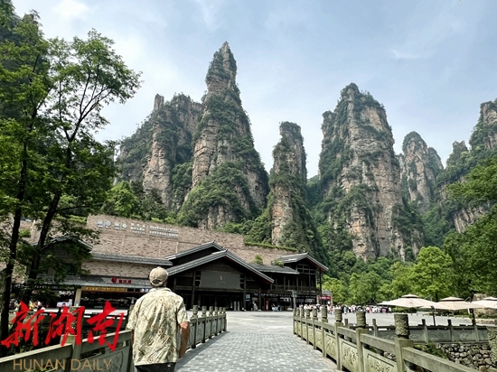 张家界武陵源景区(张家界国家森林公园)以峰称奇、以林见秀、以谷显幽,森林覆盖率达98%,负氧离子含量常年保持1万个/立方厘米以上,是老年人出游度假、避暑康养的绝佳胜地,各大景点随处都能看到“银发一族”的身影。他们热情高涨,在峰林 秀水间乐享“夕阳红”,或嘻嘻哈哈与同伴打趣、或高举自拍杆随音乐起舞、或摆个造型来张大合照……“这里的山好水好,简直是人间仙境,来爬爬山,呼吸一下新鲜空气,特别舒服。”游客张女士说道。