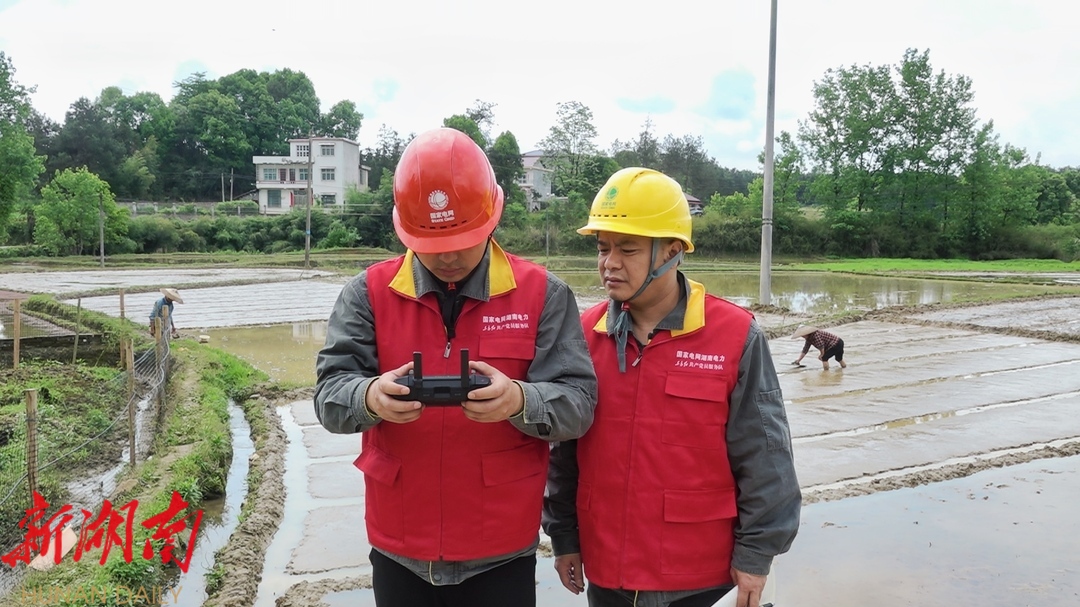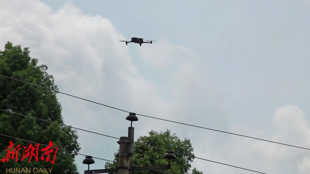在高沙镇樟树村,国网洞口县供电公司高沙供电所党员服务队员黄斌、赵成对10千伏高峰线大洲支线83号-154号电杆开展拉网式巡视。无人机搭载高清摄像头和传感器,实时传输图像和数据,巡检人员操作遥控器,通过观察传回的画面,仔细检查避雷器、绝缘子等设备的运行状态和供电可靠性,认真排查安全用电隐患,为农业生产保驾护航。