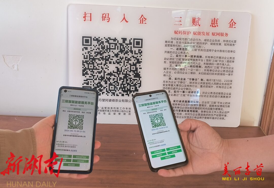 丹望茶业下属合作社——吉首市丹望黄金茶专业社2021年获得的绿色食品证书即将到期,为帮助企业维系品牌、按时续展,州、市绿办按照“三赋平台”工作机制及相关工作要求开展入企调研服务,访企前提前向企业发起预约,经审批同意后再入企,入企检查前扫码登记,显示“绿码”开展工作。