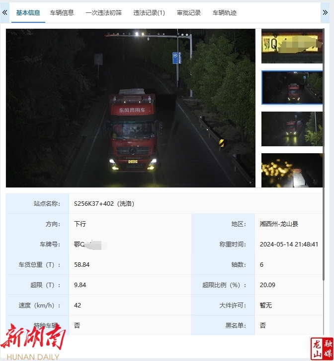 5月14日晚21点48分,驾驶员谭某驾驶鄂Q籍挂车途经S256洗洛路段被货运车辆超限超载不停车检测系统检测出涉嫌超限违法运输。