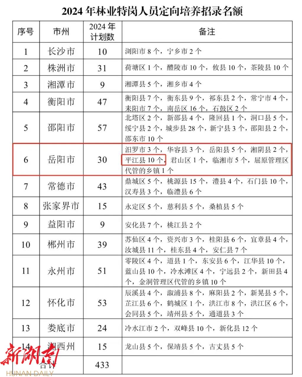 此次招录计划中,平江县计划招生10人。