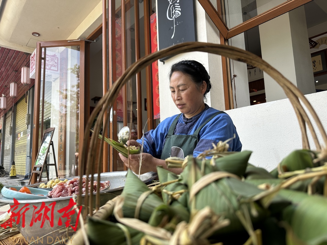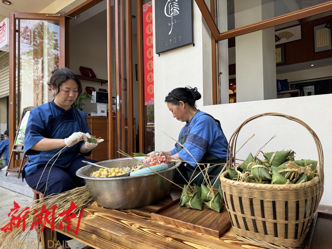 在县城一家名为女书手信的特产店内,包粽子的阿姨们正在娴熟地绕着稻草给粽子打结,灰水粽、蛋黄粽、肉粽……品类丰富。厨房内,当天的第一锅粽子随着沸水翻滚,粽叶已经微微泛黄,粽香四溢。