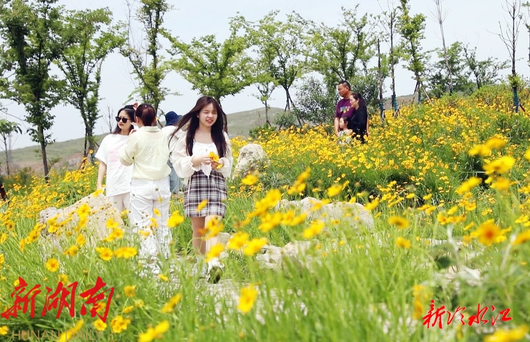 “五一”假期以来,每天都有数千名游客到锡矿山赏花游玩。随着气温上升,两山生态广场的金鸡菊进入了最佳 观赏期,花朵绵延数里,鲜艳怡人。