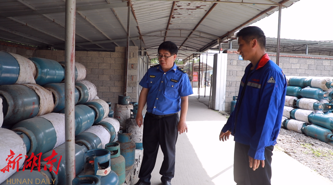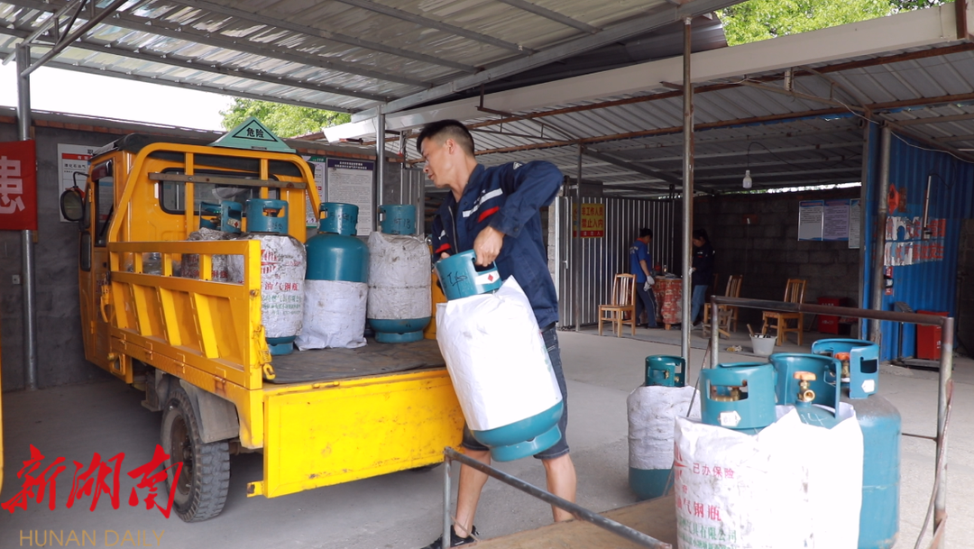 在江永顺达燃气有限公司,工人们各司其职,待充瓶常规检查、扫码入库、等待充气、扫码出库,严格的充气流程进行得有条不紊,检测合格的瓶装液化气就能被送往用户家中。该燃气公司负责江永县城、松柏瑶族乡、上江圩镇,约5000余户村(居)民的入户配送工作,目前已有配送员工15名,送气三轮车10余辆。
