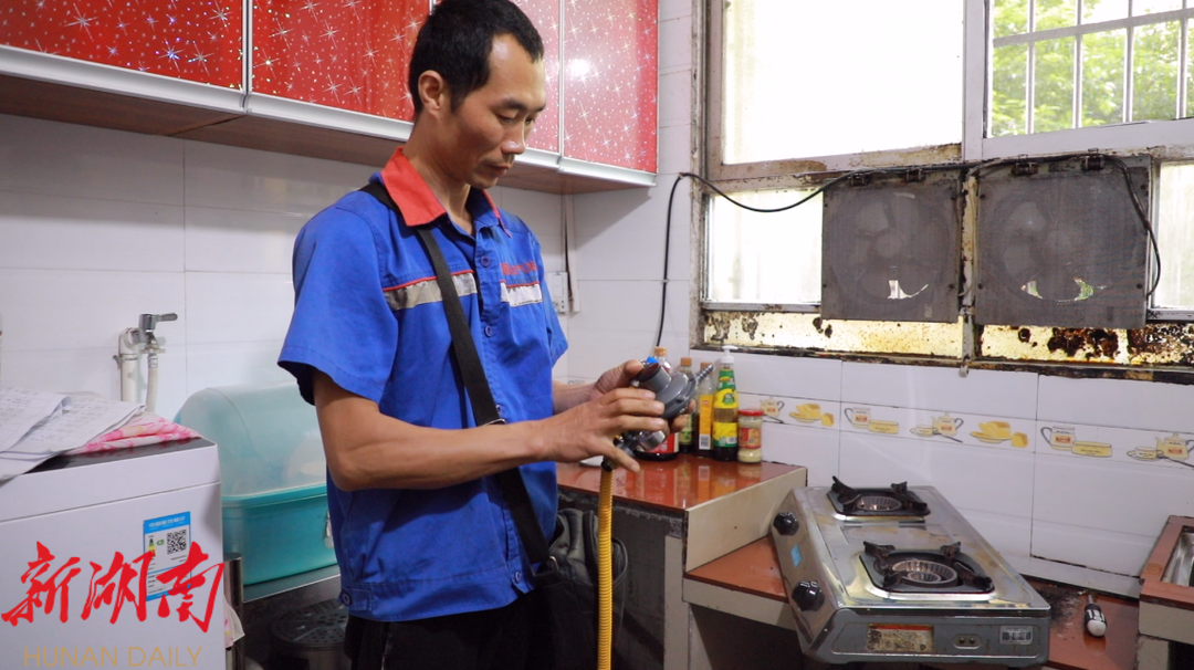 在潇浦镇永新社区,配送员正在为李女士家安装新国标的减压阀和金属软管,更换上新气瓶,再对灶具进行检查,确保燃气使用安全无泄漏。