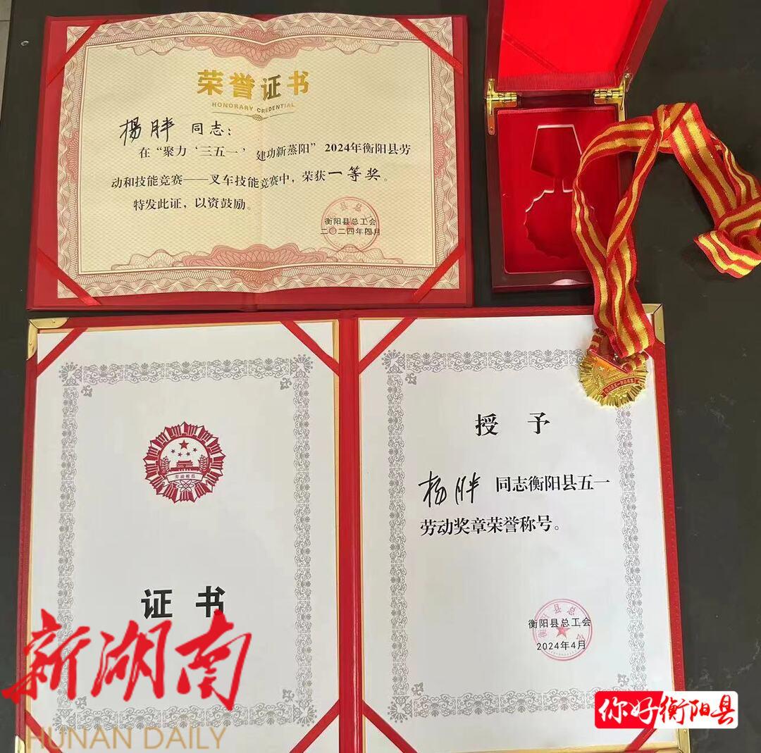 自2021年入职公司以来,杨胖每天叉运货物200余吨,3年来累计叉运货物超过18万吨。在今年我县劳动和技能竞赛-叉车技能竞赛中,杨胖从衡阳县高新园区企业的10名参赛选手中脱颖而出,圆满完成宽货进窄门、巧绕障碍和叠托盘等项目,荣获一等奖,被授予县五一劳动奖章荣誉称号。