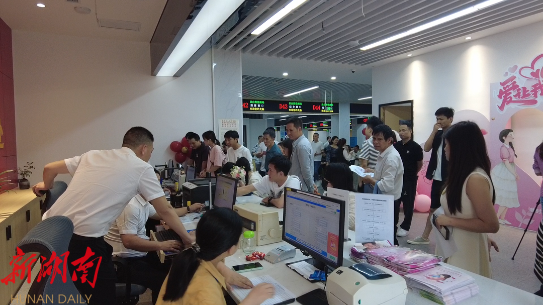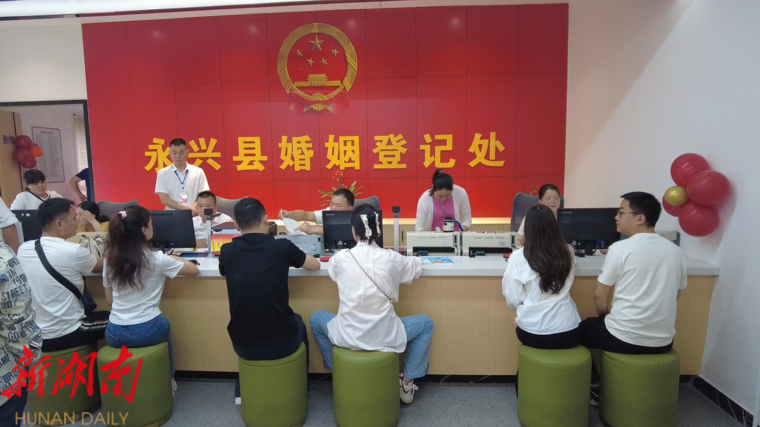 截至当天下午18时,永兴县民政局婚姻登记处共为70对新人办理了结婚登记。