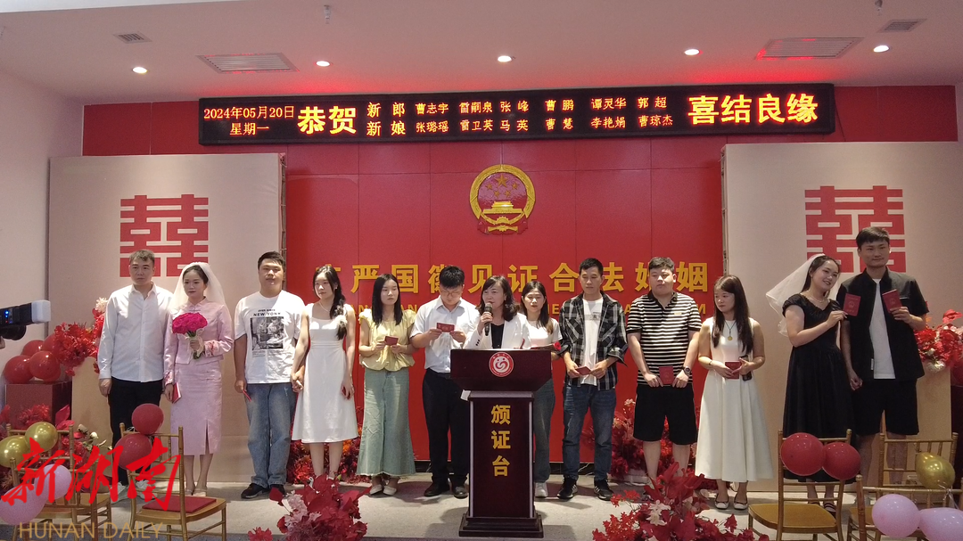 湖南日报·新湖南客户端5月21日讯(记者 李璐倩 通讯员 王宏辉 )“520”谐音是“我爱你”,许多新人早早将结婚登记定在这一天。5月20日这天,永兴县民政局婚姻登记处早早就精心准备了,为前来登记结婚的新人举办了很有仪式感的集体颁证仪式。