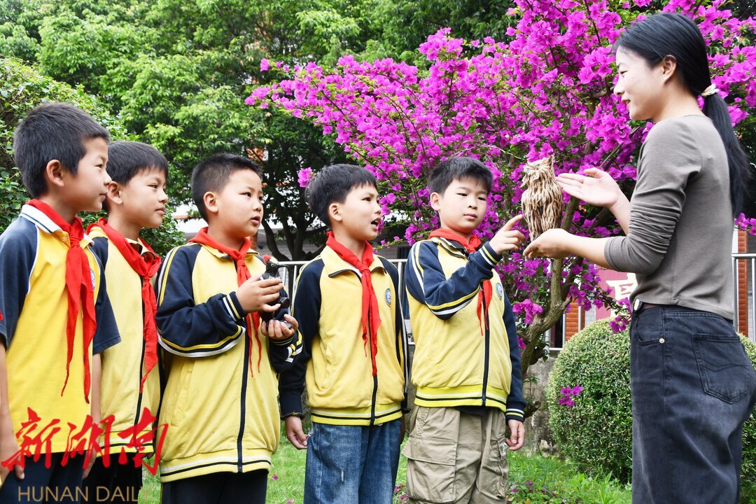 新江永客户端讯(通讯员 田如瑞) 5月22日,江永县第三小学老师为学生讲解保护鸟类知识和植物生长知识。当天是“国际生物多样性日”,2024年的主题是“生物多样性、你我共参与”。该县中小学校开展“生物多样性 你我共参与”主题活动,增强学生爱护动植物意识。
