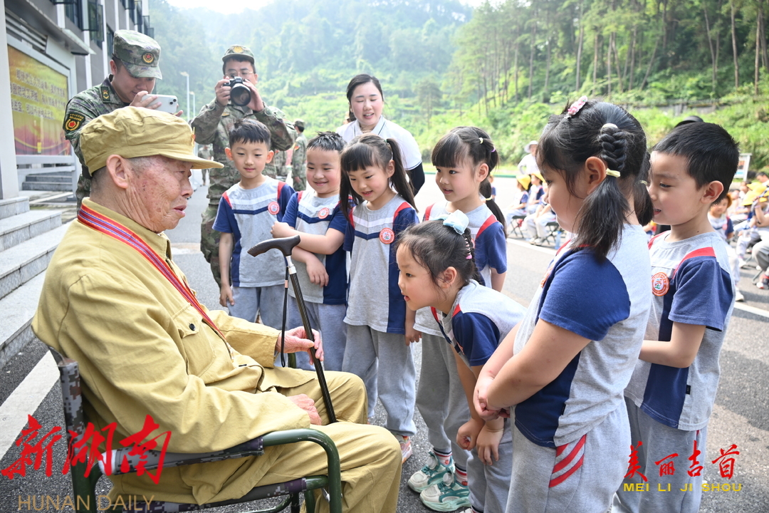 小朋友们在老师的带领下,排成整齐有序的队伍,徒步2公里前往军分区训练基地。他们一路上欢声笑语,充满好奇与期待。到达基地后,小朋友们首先聆听了94岁抗战红军彭官荣爷爷讲述的抗美援朝故事,这些英雄事迹让孩子们深受触动。