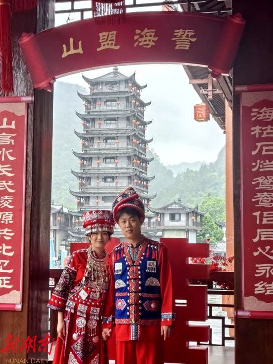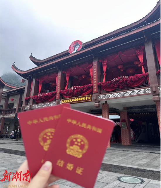 据悉,自湖南省婚姻登记开启“全省通办”以来,武陵源区民政局抢抓先机,将设立在标志门广场的婚姻登记中心打造成为“全省通办”样板,独具特色的土家绣楼装饰风格、传统的土家婚服和“山盟海誓”爱情打卡圣地等吸引各地游客前来打卡,深受年轻人的喜爱,让张家界成为婚庆旅行的主要目的地和世界婚庆旅游合作交流平台。