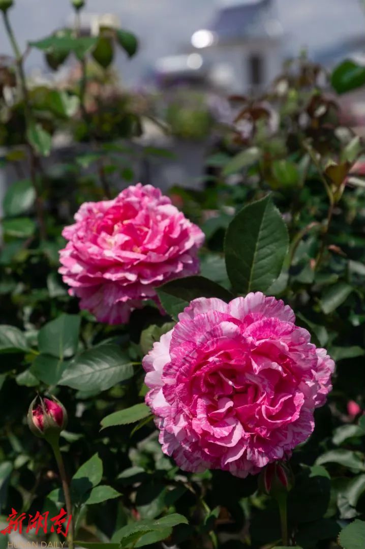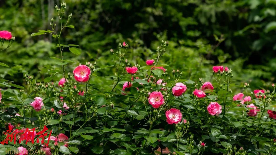 孟夏时节,暖风习习,放眼望去,月季盛放,萤火点点。在蓝天白云之下、万丈阳光之中,感受花的芬芳与明艳。绿色枝叶簇拥着层层叠叠的花朵,姹紫嫣红、娇艳欲滴的月季花迎风摇曳,空气中弥漫着浓浓的月季香气。