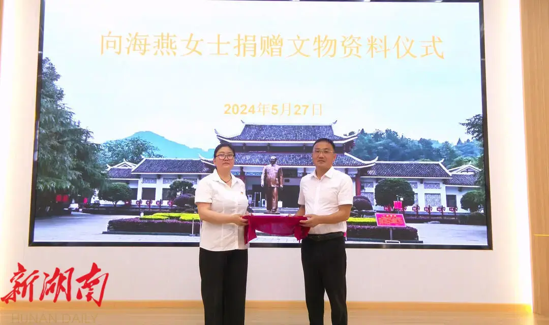 湖南日报·新湖南客户端 5月28日讯(记者 张芬)5月27日,革命烈士贺满姑后代向海燕向贺龙纪念馆捐赠了老红军贺文玳生前的手稿、照片等文物,贺龙纪念馆馆长张先政接受捐赠并为向海燕颁发捐赠证书。