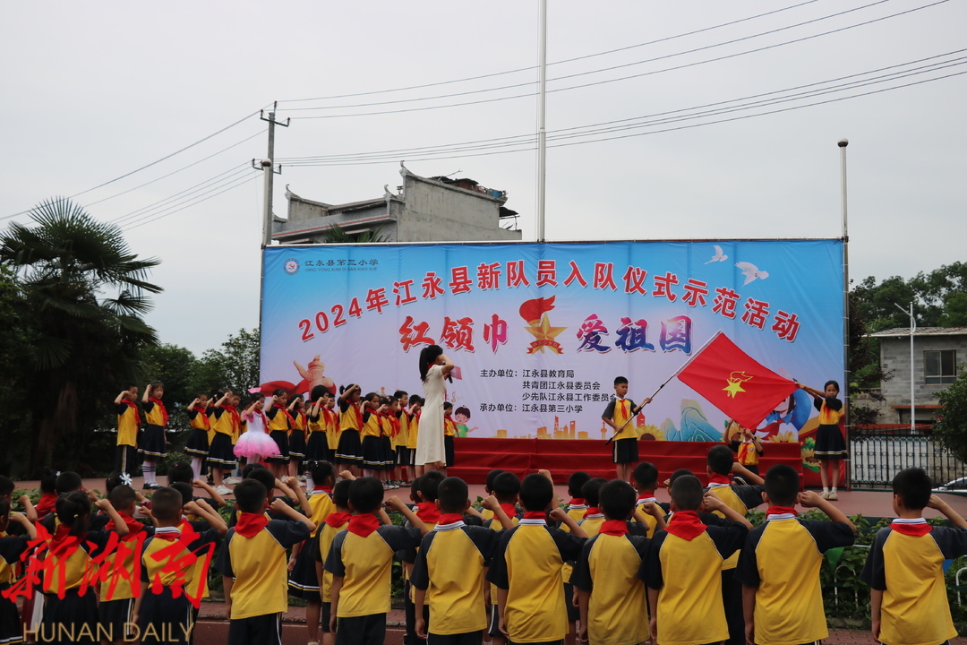 新江永客户端讯(通讯员 申佳琪 赵晓薇) 5月29日,江永县“红领巾 爱祖国”2024年“六一”主题队日示范性活动在江永县第三小学举行。本次活动旨在欢迎新队员加入少先队这个光荣的集体,并让他们深刻感受到少先队员的责任与使命。