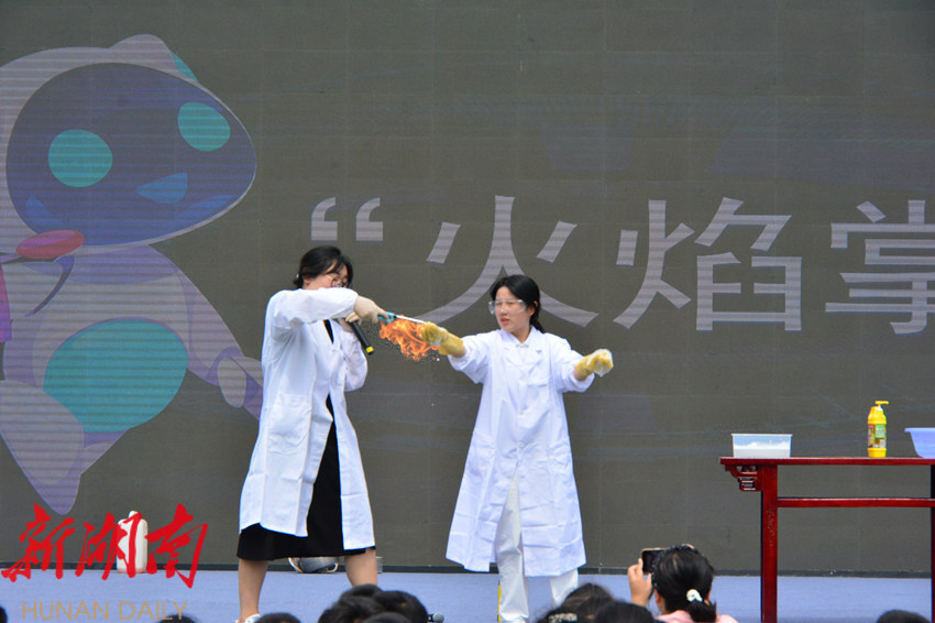 在开幕式环节,一段段感人至深的科学家故事宣讲结束后,学校校长冯骞慧代表全体师生欢迎各位嘉宾、家长的参与,对学校的科技工作进行全面汇报。紧接着,十佳科技工作者、最美科技辅导员有序上台领奖,进一步激励科学教师积极性。在科学秀环节,“火焰掌”“大象牙膏”“马德堡半球”一个个近距离科学实验,让孩子们身临其境感受科技的魅力。书法家协会题字赠予学校,并希望学校越办越好。同时还有学生操作无人机飞上天空、“变形金刚”机器人表演等。