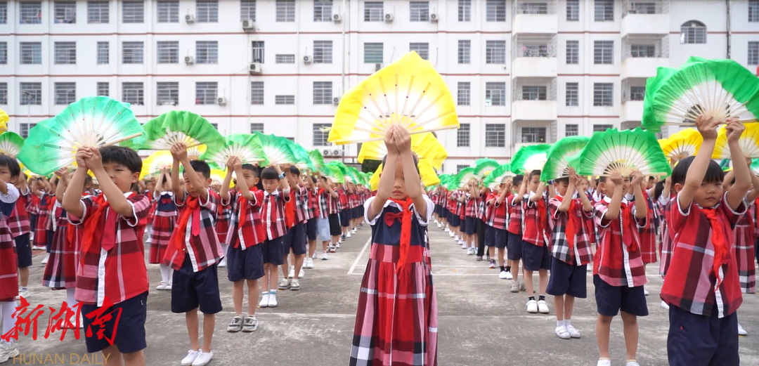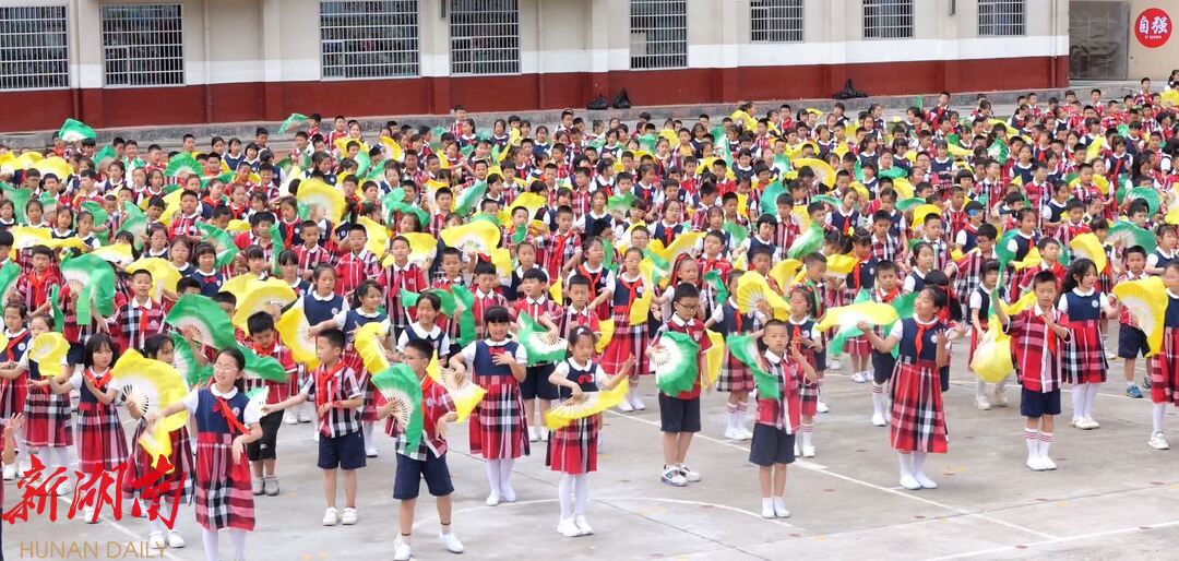活动现场,一年级至五年级的学生们依次表演完年级社团舞蹈后,3600名学生在操场上有序排开,“四季花儿开~花开是一朵来...” 伴着动听的桑植民歌《四季花儿开》欢乐悠扬的声音传入耳,大家动作整齐划一,开始摆动着手中的扇子,跟随着音乐节奏翩翩起舞,个个精神抖擞,神采奕奕。