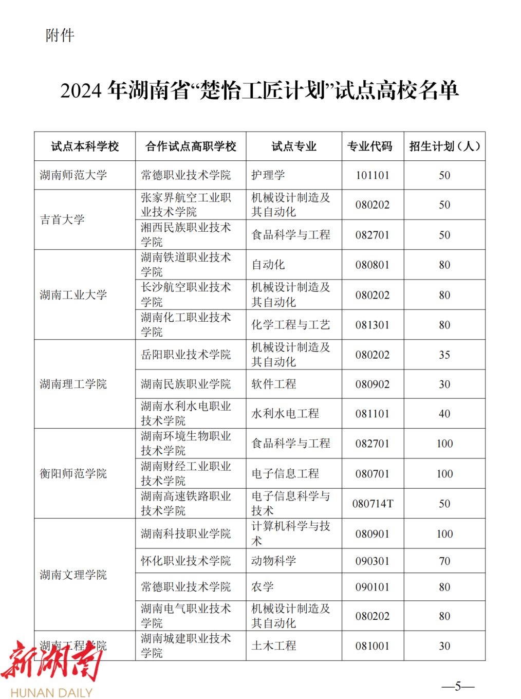 同时,“楚怡工匠计划”的招生计划由省教育厅统筹安排下达,纳入本科高校相应层次2024年度招生总计划,招生人数计入本科高校生均办学条件计算范围。