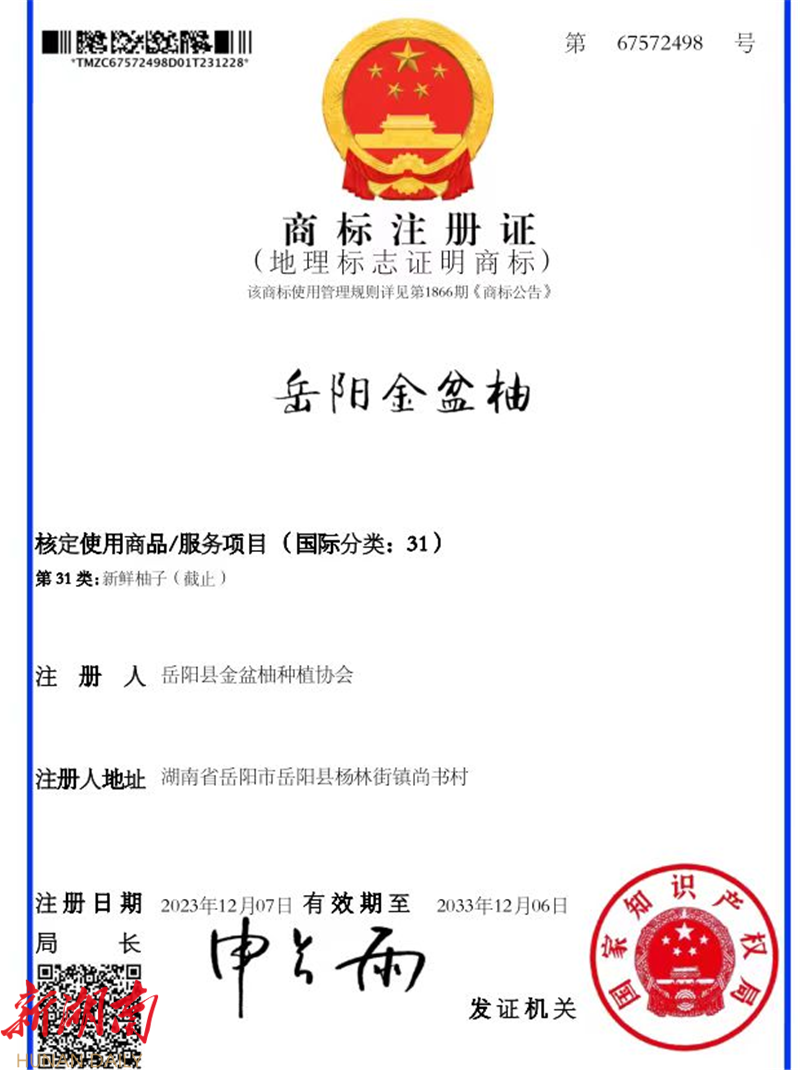 岳阳县金盆柚种植协会申报的“岳阳金盆柚”商标主打金盆柚品牌,2023年12月,国家知识产权局注册为地理标志证明商标。