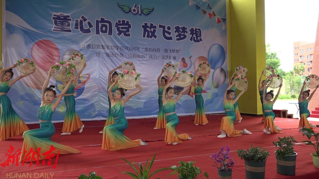 江永县思源实验学校举办2024年“童心向党•放飞梦想”暨“诵读经典•诗润童心”庆六一活动,活动现场气氛热烈,孩子们身着节日盛装,精神焕发,精彩的节目一个接一个,歌声悠扬动听,舞蹈充满活力,国学诵读声音洪亮,节目涵盖多种艺术形式,展现了新时代少年儿童的技能与才华。