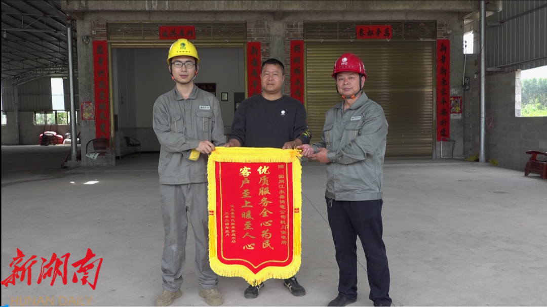 新江永客户端讯(记者 欧阳文 彭兰 ) 近日,粗石江镇鸟源河村周氏鲜果家庭农场负责人将一面印有“优质服务全心为民 客户至上暖至人心”的锦旗送到了国网江永县供电公司桃川供电所负责人手里,感谢该供电公司及时解决了乡村产业发展用电问题和鸟源村村民生活用电难题。