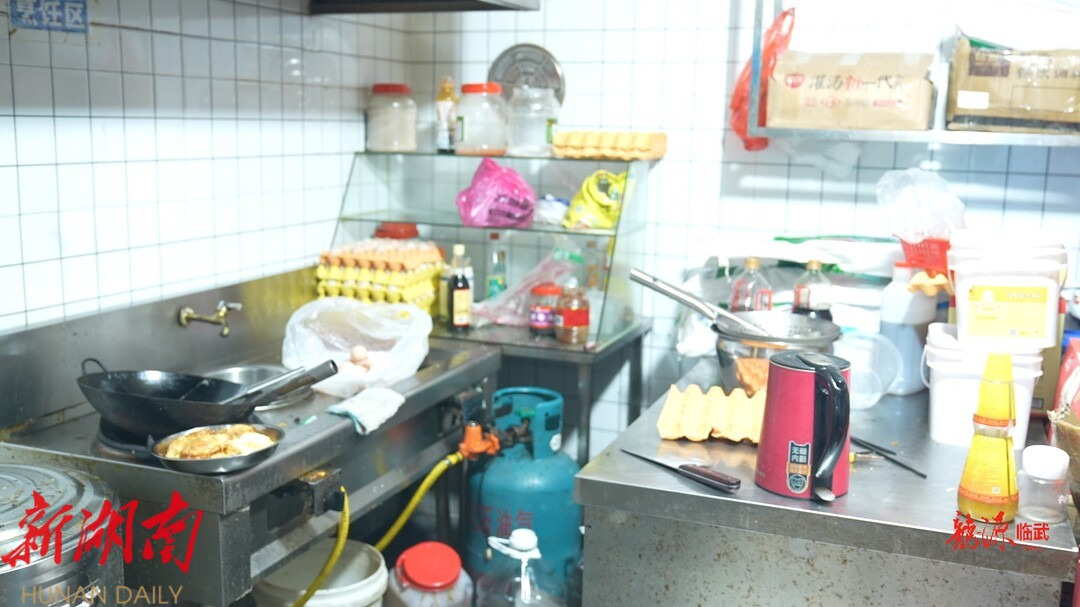 在位于文昌路的这家螺蛳粉店,执法人员发现,在后厨的桌面上摆放着炸好的鸡蛋,地上摆着一大桶粗加工的米粉,均未加盖覆膜,防蚊、防虫、防鼠“三防”措施不到位,非常容易滋生细菌蚊虫。