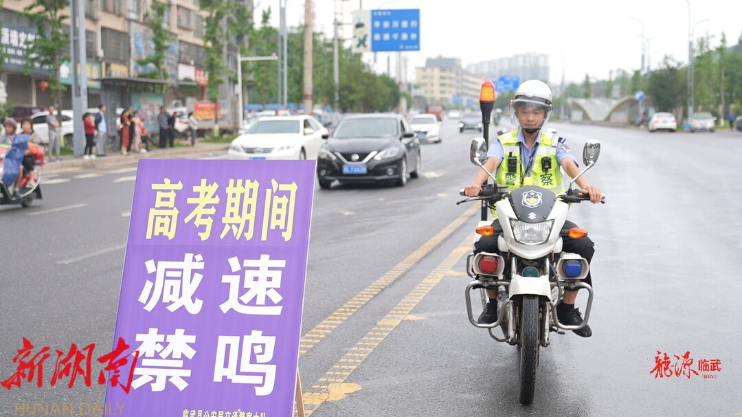 早上六点多,在临武一中路段,来自县交警大队的民警们就在临近考场的各个路段设置警示牌、警戒线。