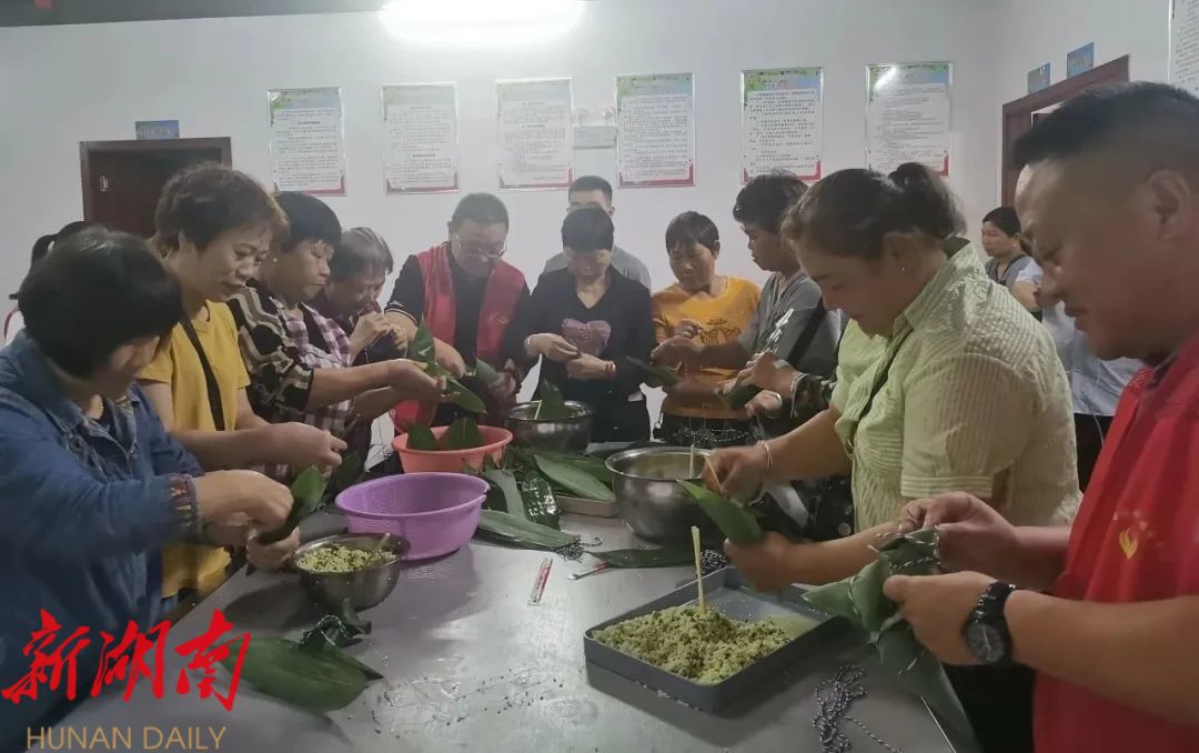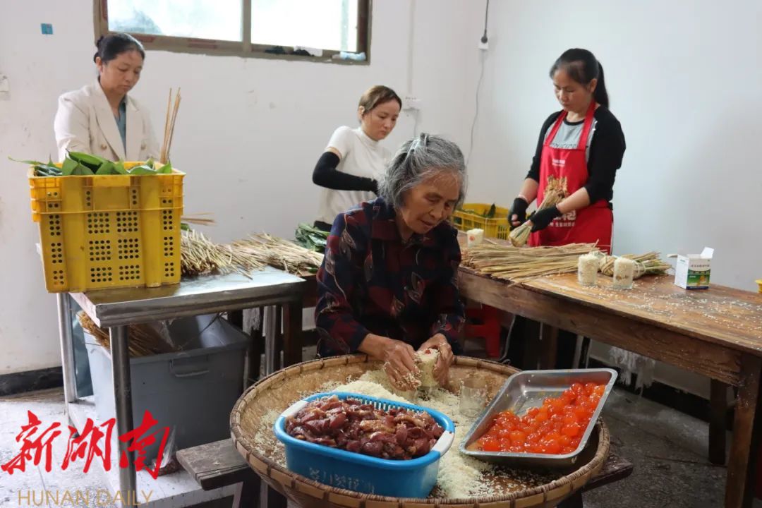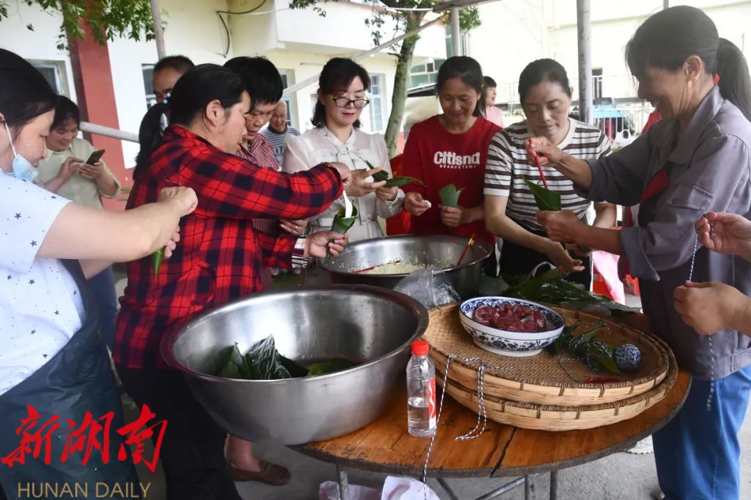 端午节之际,新邵县迎光乡迎光村村民周桂芳家的空气中弥漫着一股糯米的清香,院子内一派忙碌景象,村民们围坐在桌旁抓紧包制稻草粽。