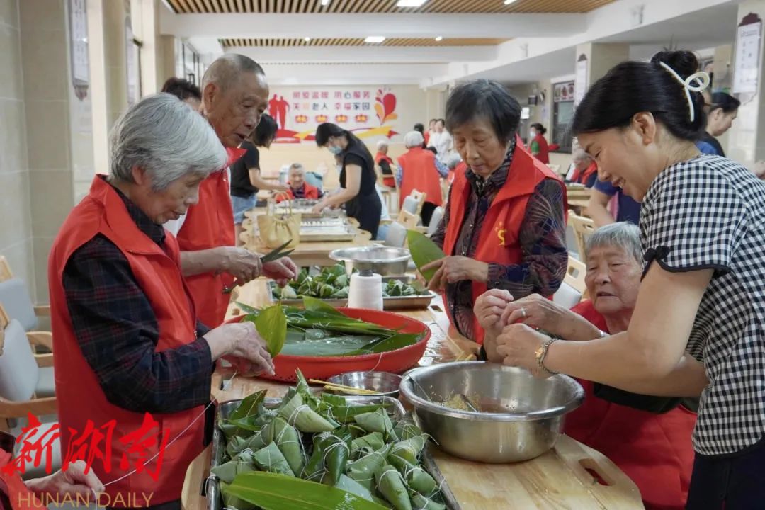 6月7日,新邵县邵阳雨泉老年公寓的50余名老人与工作人员一起,包粽子、话家常、唱红歌迎接端午节。活动现场气氛热烈,老人们热情高涨,纷纷亮出看家本领,相互分享包粽子的诀窍,捋叶、卷筒、填料、压料、扎绳……一个个漂亮的粽子瞬间完成。在包粽子之余,大家聊着家常,说着心里话,还齐声唱起激昂的红歌,共同沉浸在节日的温馨与欢乐之中。(杨能广 张海兵 孙咏梅)