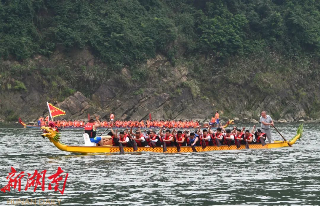 6月9日,新邵县坪上镇筱筀村、筱溪村联合冷水江市麻溪村、新田村,在资江筱溪段举行龙舟友谊赛,用“速度与激情”迎接即将到来的端午节。