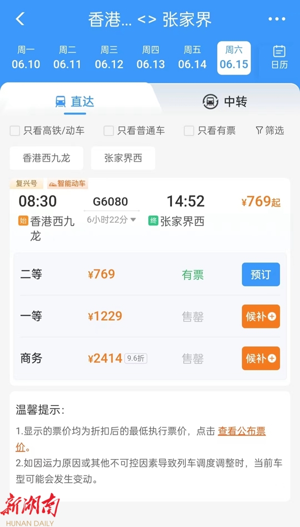 6月1日讯(记者 覃蕾)从6月15日起,张家界、香港两地居民可以乘高铁直达往返两地旅游了! 香港铁路有限公司5月30日宣布,广深港高铁香港段将在6月15日起增设往来湖南省的长途线。新开通的线路由香港西九龙站往返湖南张家界西站,新增站点包括邵阳、怀化南、洞口、凤凰古城、吉首东及张家界西,每天提供往返各一班列车服务,车程为6小时22 分,二等座全程769元,相关车票将于6月1日起开始发售。 值得一提的是,到达张家界西站后,可到出口对面乘坐直达武陵源区(景区东门)或张家界国家森林公园(景区南门)的城景公交(约30分钟,13至15元/人,大约15分钟一班),或者出租车/网约车(费用则约100元左右)前往景区,看三千奇峰、八百秀水,领略张家界武陵源景区绝美自然风光。 (一审:吴文锦 二审:李欣雨 三审:张陆韬)
