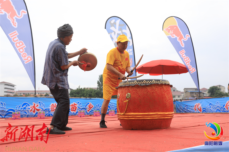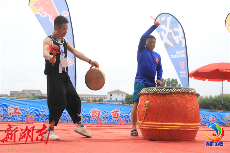 6月12日,第十届长河传统龙舟争霸赛在麻阳苗族自治县吕家坪锦江河段开赛。活动现场,数千名群众同唱极具麻阳地域特色的原生态龙船号子,老中少三位鼓手用激昂的鼓点展示鼓艺,各地游客直夸这样的龙舟赛好看好玩。