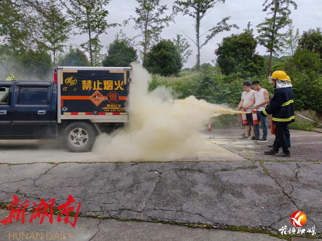危货车辆应急救援演练模拟场景中,由于气候炎热,花垣永安爆破工程有限公司中心库84#仓库外发生不明燃烧物,仓库从业人员赶到起火点,查看火势,迅速取出消防器材,主动施行灭火行动,并查看起火原因,上报总公司应急管理领导小组。