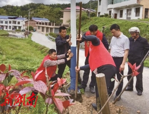 ▲长冲村党员齐心协力加固公路沿线电线杆。通讯员供图