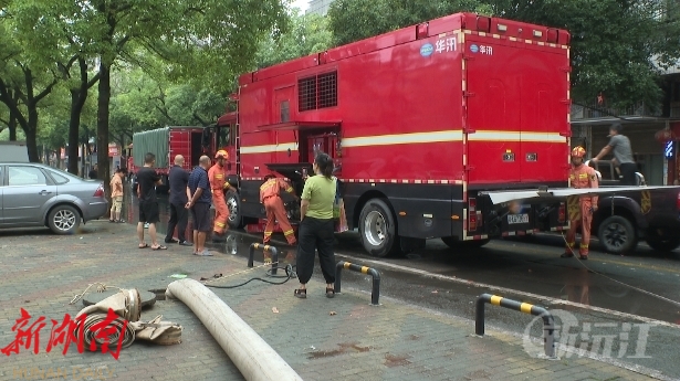湖南省(应急)消防救援机动四大队指导员景勇豪介绍:“在我身后的是一台华讯排涝车,车上估计有八个泵,四个250毫米供水的水带,四个100厘米的排水泵。今天我们根据现场的地理位置,采用的是两台250毫米抽水泵,我们总共是八台泵,加在一起供水流量每小时大概是2500-4000立方米。”