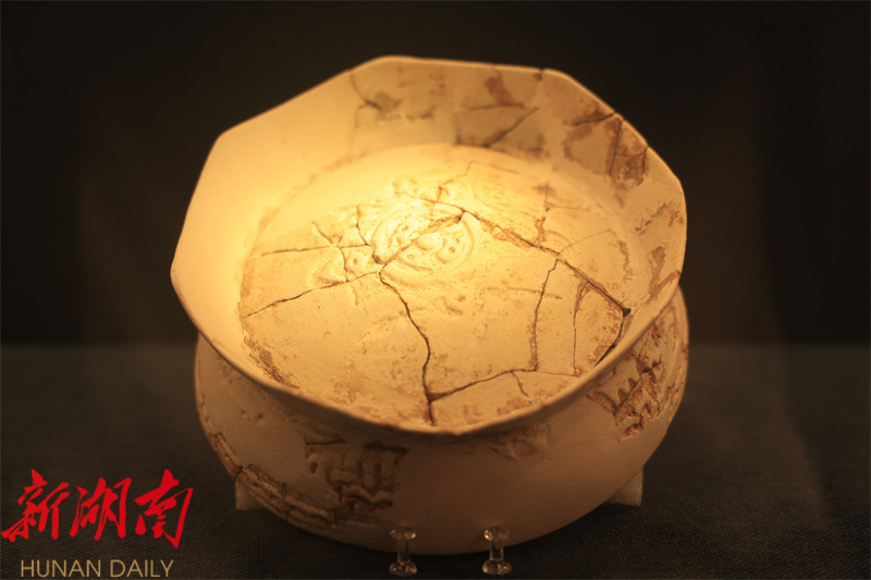 郴州博物馆讲解员曾丽莎介绍道:“我们看一下千家坪的凤鸟纹,中间还有个圆圈,它象征着我们天上的太阳,这样的凤鸟纹向我们表达的就是,我们的先民们对我们自然的崇拜和对神明的奉祀,白陶已经具备了基本的美学规范,被誉为中国境内史前社会文明的第一次艺术浪潮。”