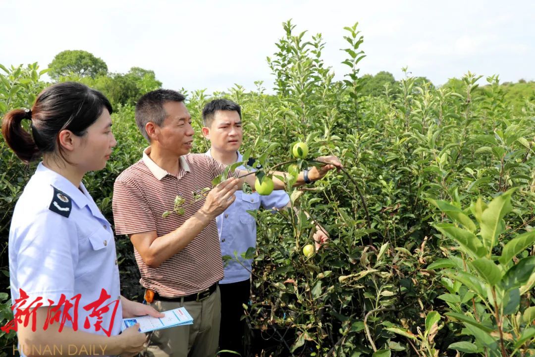 ▲石鼓税务“税惠助农”小分队在园区实地查看苹果生长情况