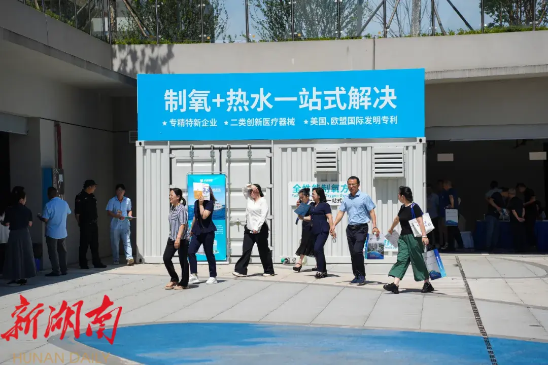 特展区域,一个形如活动板房的白色大方块设备引人瞩目,这是湖南卓誉科技有限公司最新推出的制氧+热水全性能制氧方仓。现场工作人员介绍,设备能够回收制氧时空气压缩机产生的热能,热回收率达到70%,能够显著降低能耗,减少二氧化碳排放。以ZY/MO-05为例,氧气流量5Nm3/h,氧气浓度超93%,其加热的热水每天可供318人洗澡。卓誉科技是一家集研发、生产、销售、安装售后服务于一体的科技创新型企业,其医用分子筛制氧系统通过省科技厅成果鉴定,产品覆盖1000+家基层卫生服务机构及等级医院,实时在线监管、运行稳定。