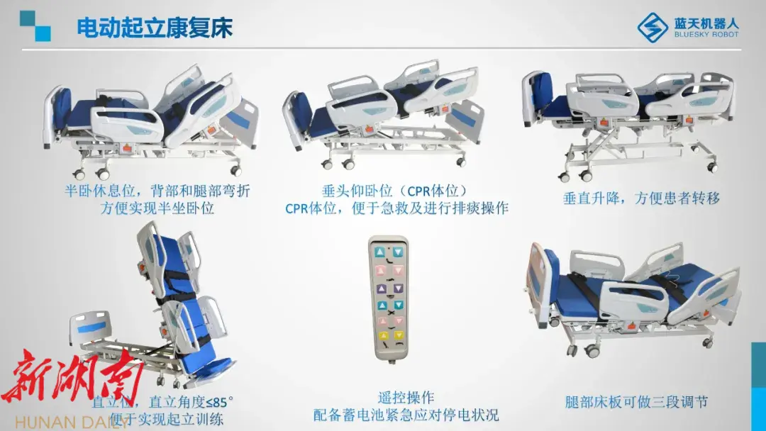 近年来,湖南蓝天机器人科技有限公司积极开拓康养领域,此次参展带来了电动起立康复床系列。其电动溶栓床可左右侧翻、整体/局部精准调节、具备“离床感应”称重等功能。现场销售人员介绍,公司的康复床质量过硬,操作方便,这两年业务发展迅速,目前已经在泰康、株洲三医院等医疗康养机构使用。