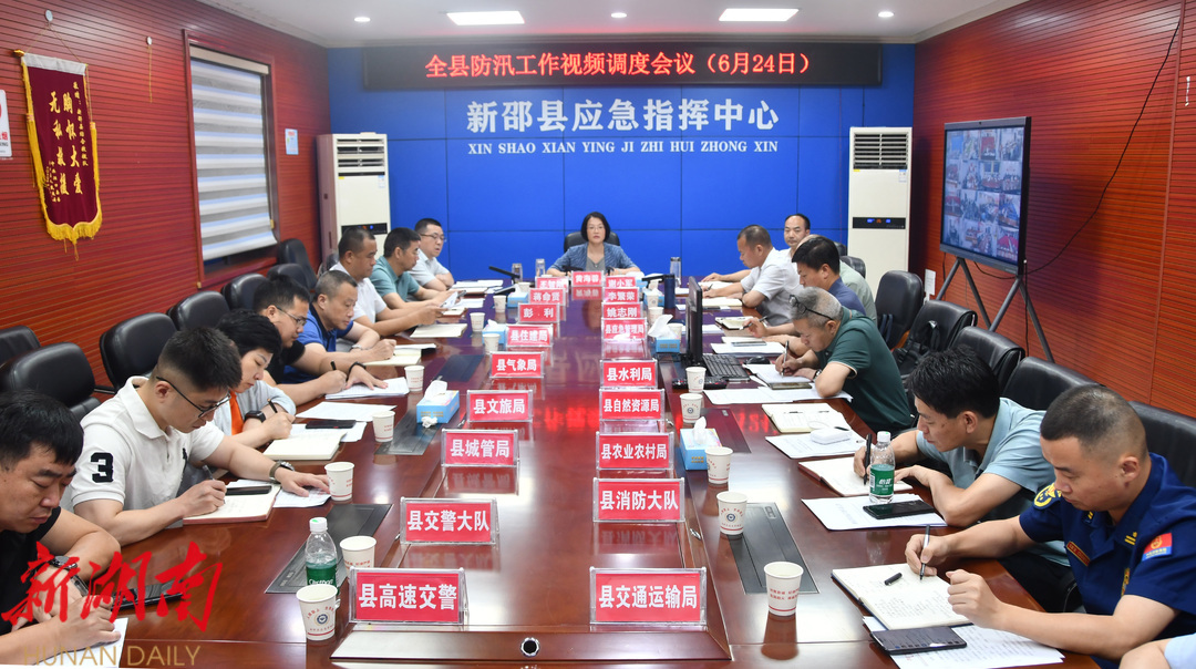 新新邵客户端6月25日讯 6月24日晚上,参加完全市防汛工作视频调度会后,县委书记黄海蓉主持召开了全县防汛工作专题调度会议,强调要深入学习贯彻习近平总书记关于防汛抗旱工作的重要指示精神,全面落实中央、省、市部署要求,始终坚持人民至上、生命至上,坚决树牢防大汛、抗大洪、救大灾意识,严阵以待,严防死守,坚决打赢防汛抗灾这场硬仗。县委副书记、县长谢小军,县领导王智刚、李繁荣、蒋命贤、姚志刚、彭利参加。会议以视频形式开至各乡镇。