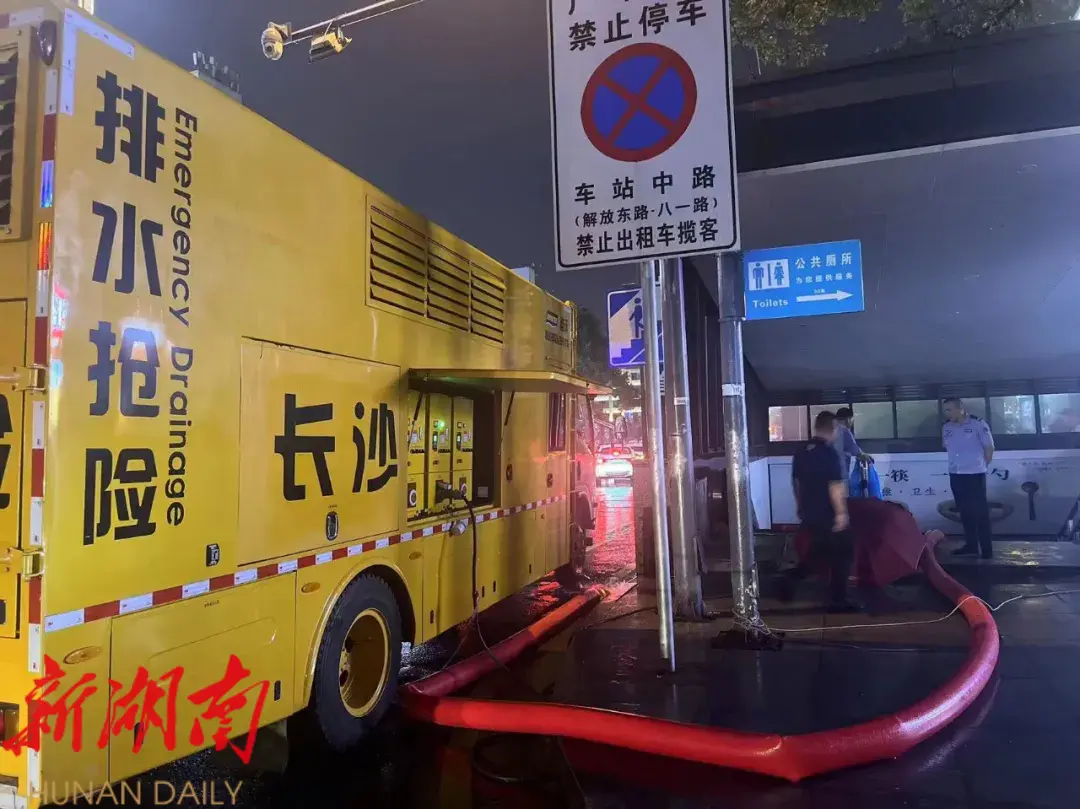 24日晚,在长沙火车站地铁站,迪沃排水车正在持续处置积水,减轻隧道排水压力。
