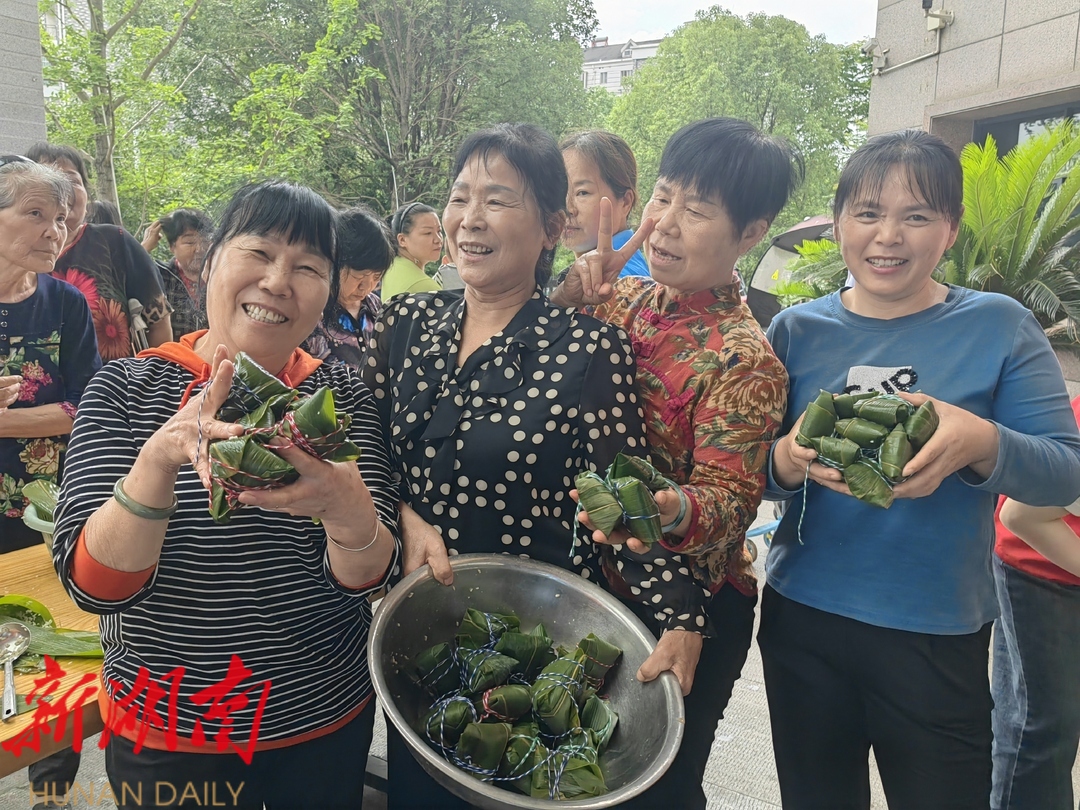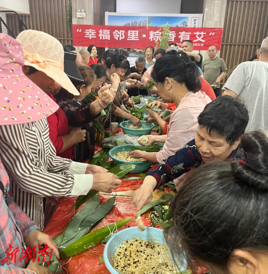在高塘社区,社区居民早早地就来到现场。70多岁的付娭毑,别看年龄大,包粽子经验老到。卷粽叶、装糯米、扯绳绑牢……不一会儿一个粽子就在她手里成型。大家伙边聊天边包着粽子,现场一片欢声笑语。