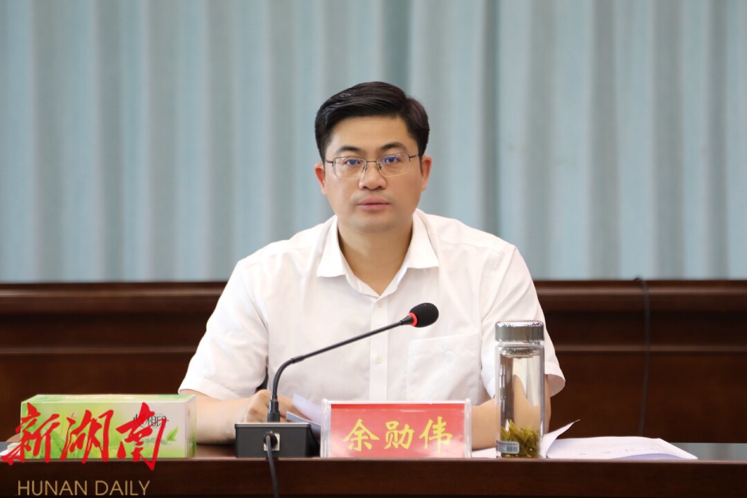图为县委书记余勋伟在会上讲话