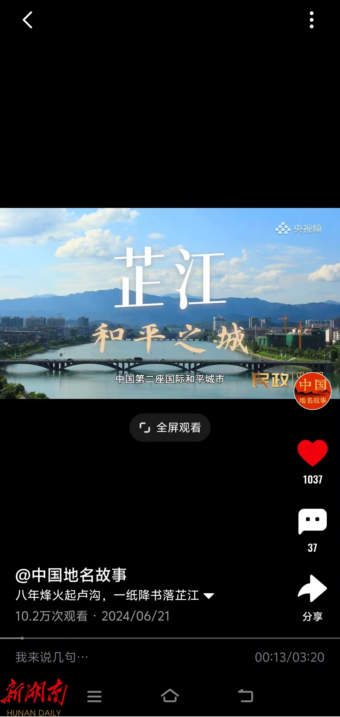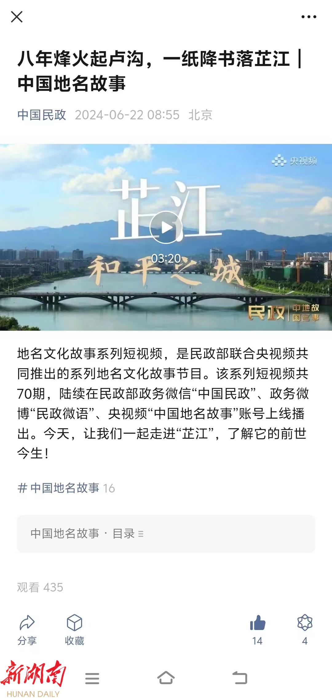 通过部、省、市各级地名行政主管部门会同相关领域专家层层审核把关,现已成功入选民政部联合央视频共同推出的系列地名文化故事节目《中国地名故事》,在民政部门户网站、政务新媒体和央视频等主流权威新媒体平台推广。《芷江·和平之城》宣传片播出后,得到了部、省、市各级民政部门领导的充分肯定和大力推介,截至目前,观看人数已超过10万+。