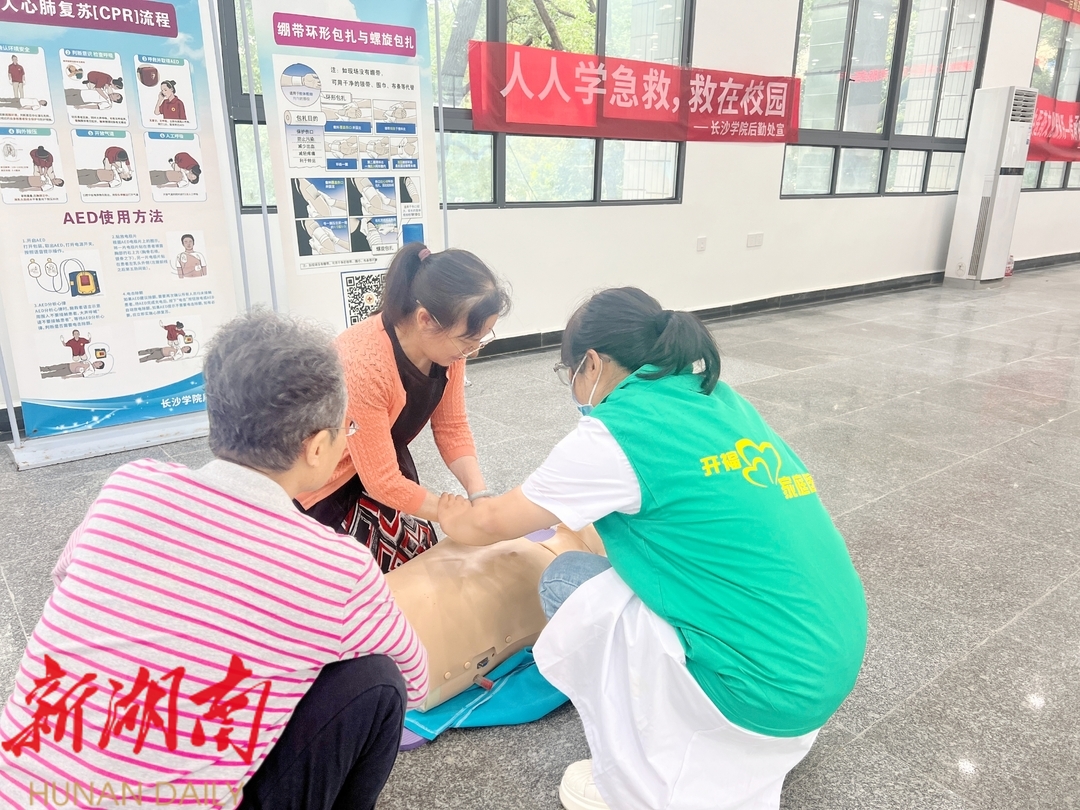 授课结束后,中南大学湘雅医院全科医学科、爱尔眼科医院、开福区洪山街道社区医院为居民提供义诊咨询、家庭医生签约、骨密度检查、眼底筛查,免费血压、血糖检测,心电图、便携式B超检查等国家基本公共卫生服务项目和省市民生项目政策宣传,另设置专门区域对前来参加活动的教职工进行急救知识普及和技能培训。