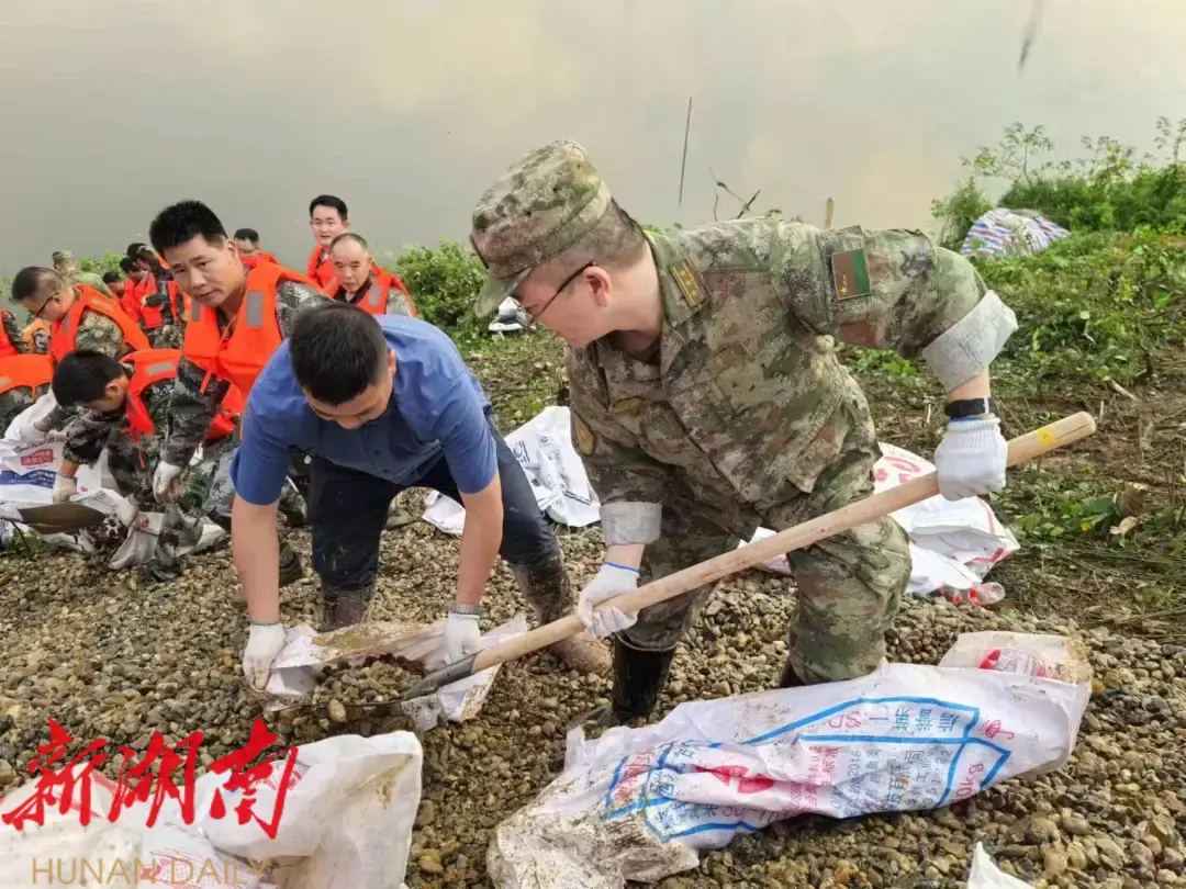 6月29日,县委常委、县人武部政委谢丰参加太子庙镇三星垸管涌除险工作。(汉寿融媒)